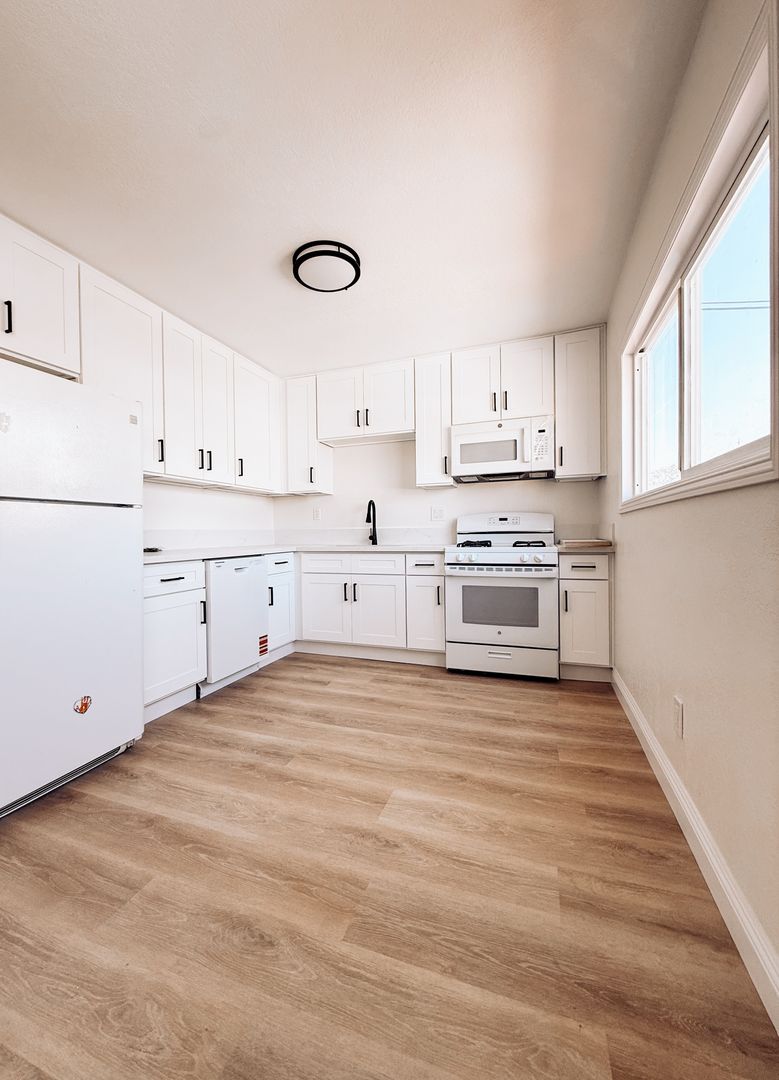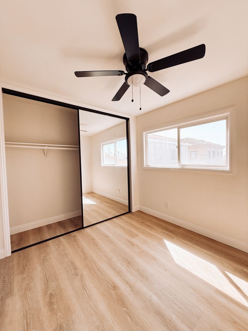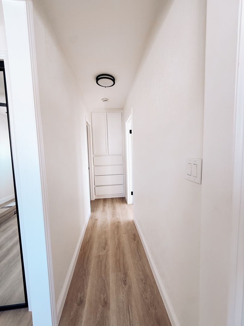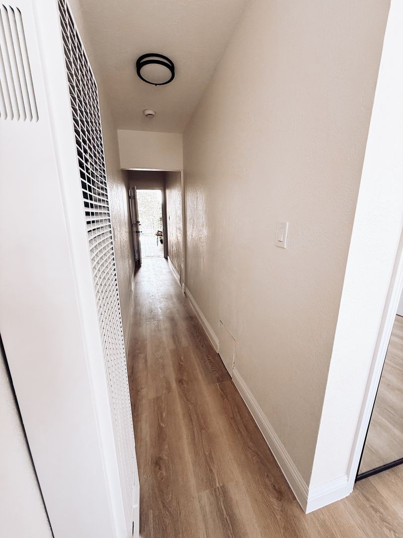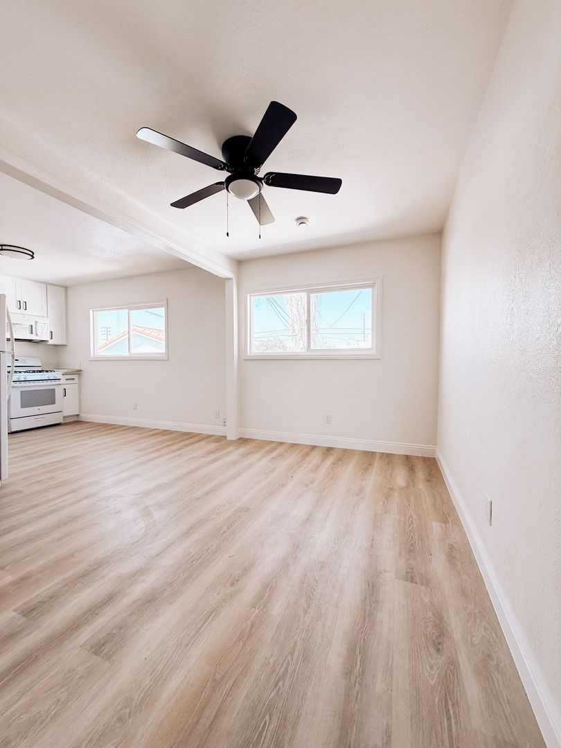Bright upstairs 1-bedroom, 1-bath apartment in Wilmington, CA. This semi-gated unit has been freshly painted and features new vinyl plank flooring throughout, a renovated kitchen and bathroom, ceiling fans, and abundant natural light. Enjoy ample interior storage and the privacy of an upstairs location in a well-maintained building.